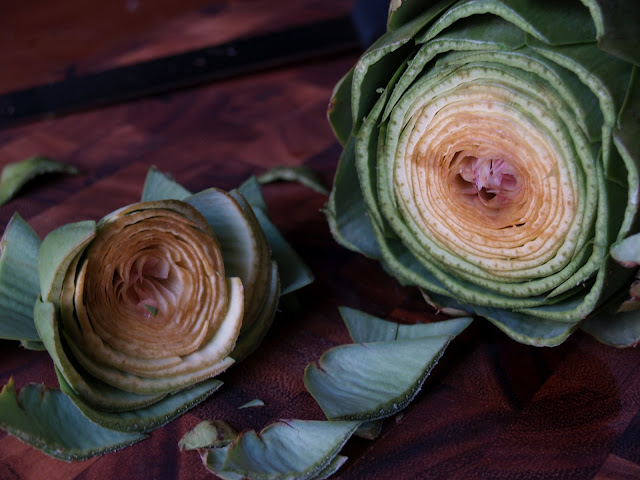 Growing up in California, I've had my fair share of artichokes. If you take a moment to think about them, they're such a strange vegetable. Every time I eat one, I can't help but wonder how anyone discovered they're edible. Nevertheless, I'm glad they did! In the U.S., artichokes are primarily grown in California and peak in the spring and again in the fall. Look for artichokes that have tightly closed leaves and are evenly green with little or no brown discoloration. They should also feel slightly heavy for their size.  I don't eat them too often on the east coast, as they can cost a pretty penny. Or maybe I'm just used to the roadside stands in Castroville, off the coast of Monterey Bay, that sell 10 for a dollar, or something outrageously wonderful as that.